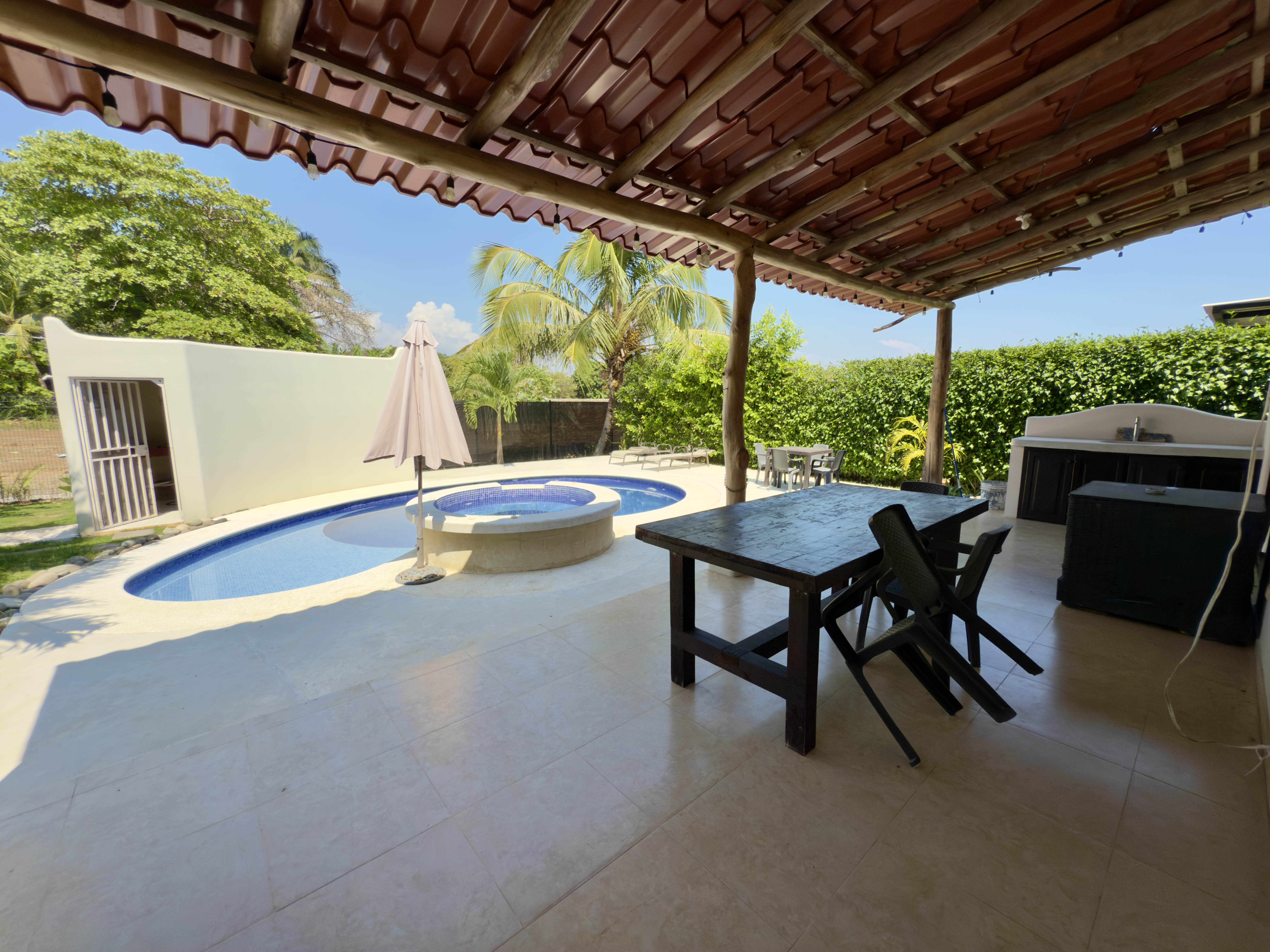• Expansive outdoor area with a BBQ zone, swimming pool, and jacuzzi