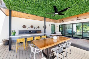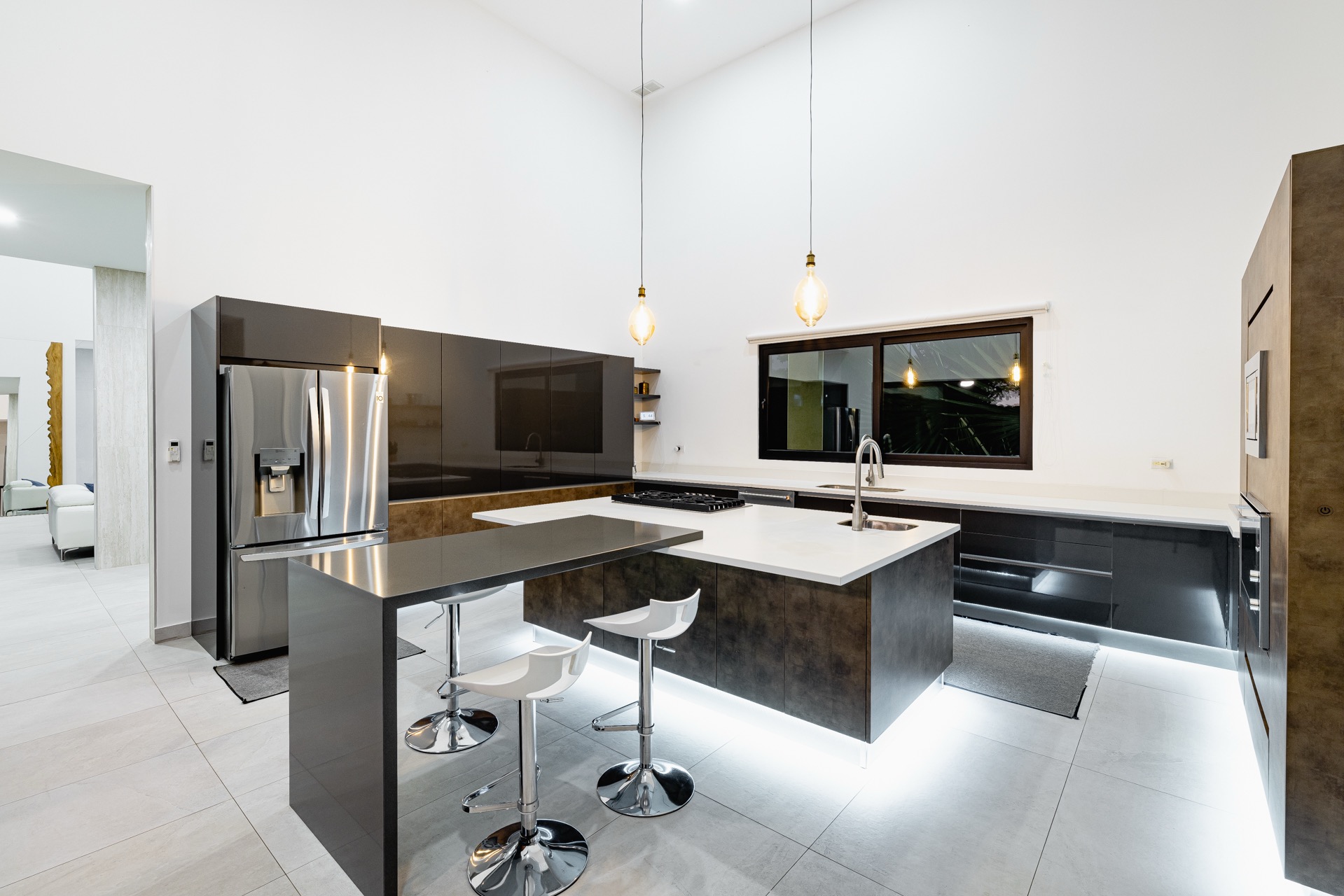 The modern and spacious kitchen is the dream of people who love to cook, as it comes fully equipped with everything necessary to prepare delicious meals in a comfortable way. The ample cooking island and the rest of the cabinetry come with lights underneath, activated by contactless sensors, giving it a modern and classy effect. The high ceiling keeps the kitchen cooler and allows for lots of natural light to fill that area. Next to the kitchen is the laundry room and the two cars’ garage, both of these areas are sizeable.