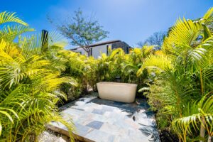 The impressive pool area is crowned by a fire pit and an outdoor bathtub surrounded by palms, where you can have very relaxing baths under the stars.